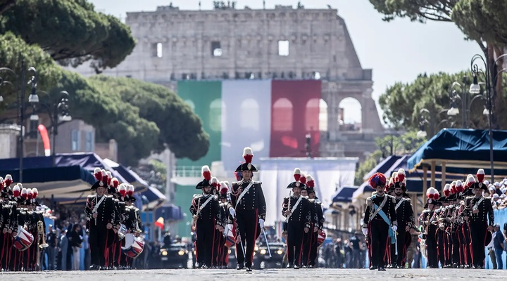 После официальной церемонии начинается военный парад на Via dei Fori Imperiali — дороге, проходящей между античными руинами Рима.