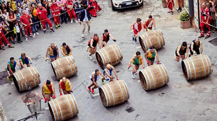 Вместо традиционного забега – мужчины толкают огромные бочки весом 80 кг узкими каменными улочками старого города. Это гонка силы, выносливости и… вина.